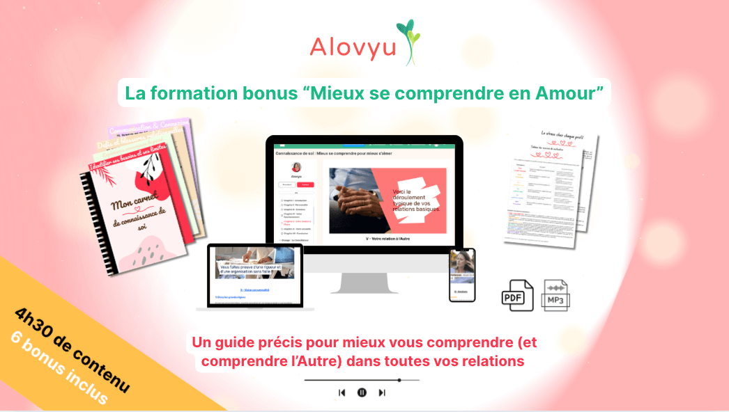Mon parcours amoureux m'a appris beaucoup sur les dynamiques de couple et les défis à surmonter. J'ai toujours faite de nombreuses recherches et me suis formée aux thérapies, à la psychologie, au coaching. J'ai décidé de réunir toutes ces informations en une seule méthode. En plusieurs années, j'ai ainsi créée la Méthode Alovyu.